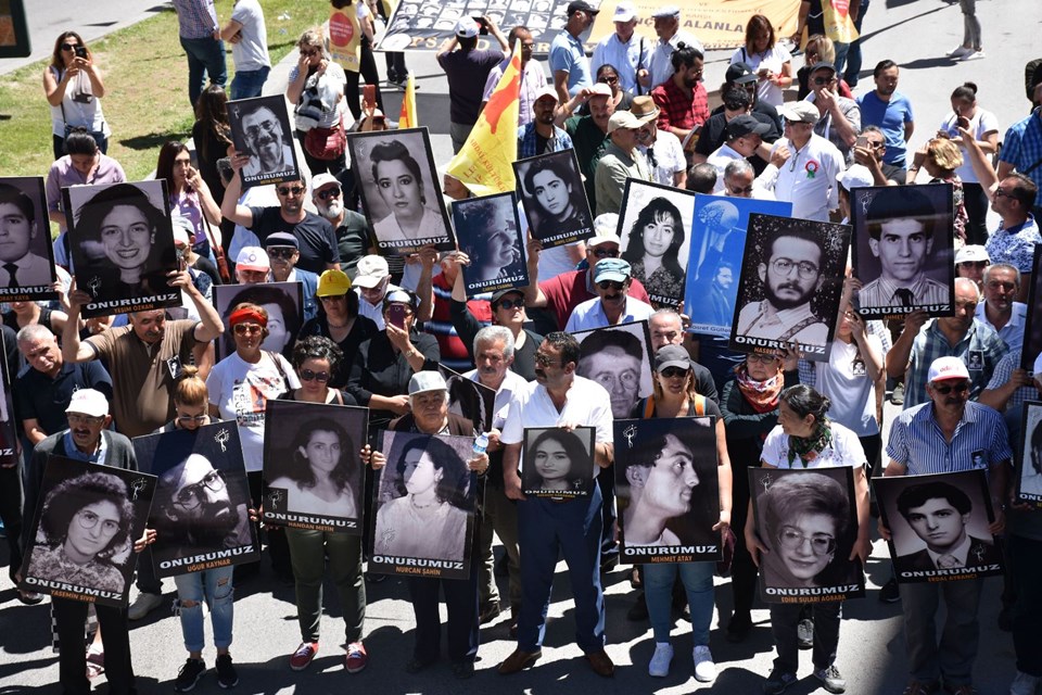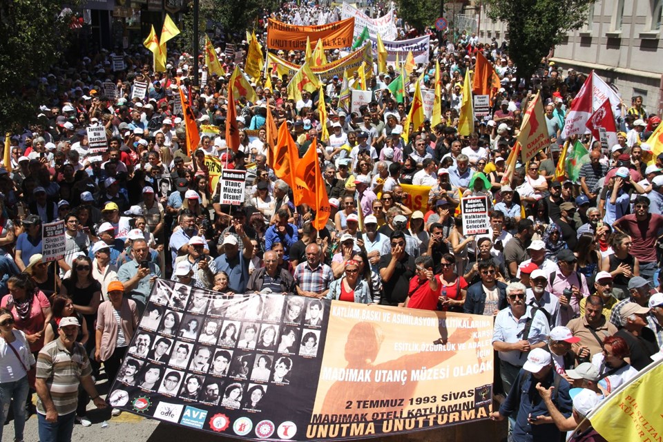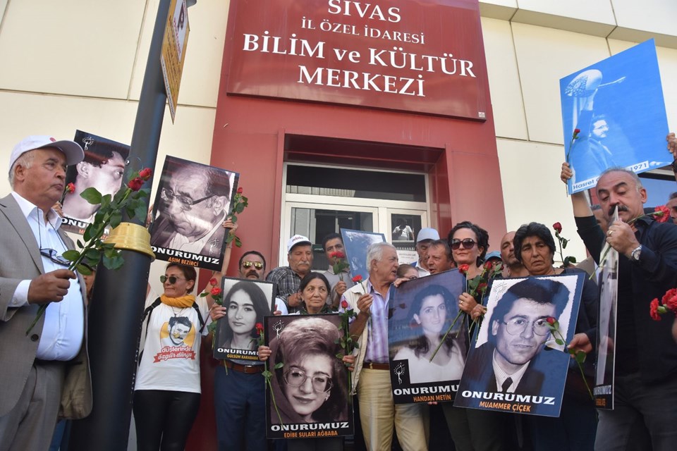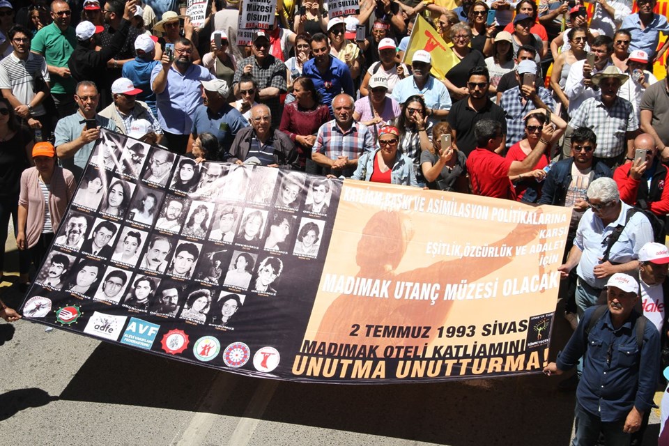 "İnsan olmanın onurunu yüreklerinde taşıyan bizler, Madımak katliamını bir kez daha lanetliyor, yetkilileri toplumsal yüzleşmeye, tarihsel sorumluluğu yerine getirmeye davet ediyoruz. Diyoruz ki insanlığa yönelik işlenen suçlarda zaman aşımı olmaz. Bu, hukukun evrensel değerlerine aykırıdır."