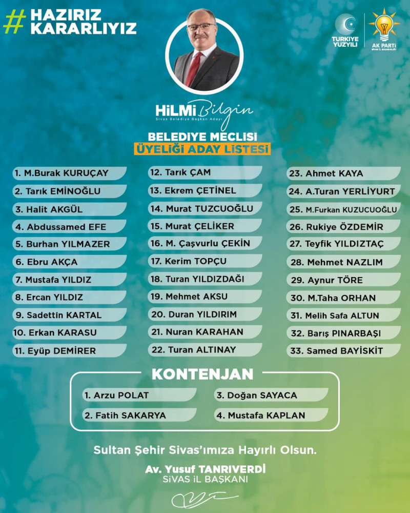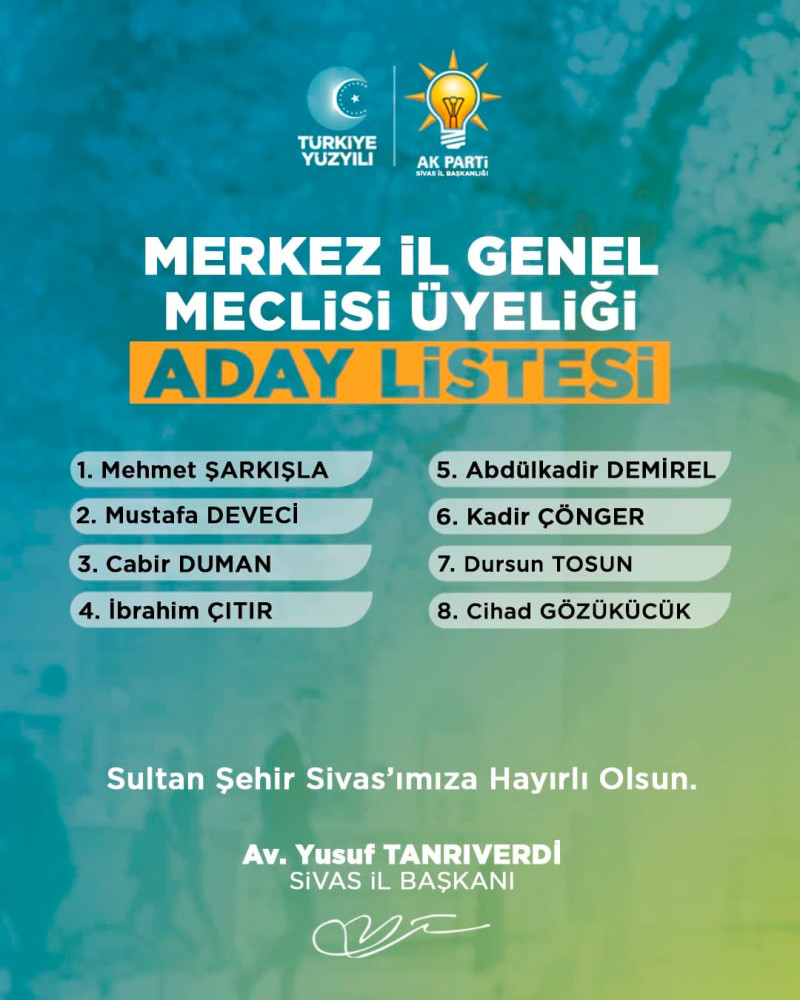 Ak Partinin Sivas Belediye Meclis ve il Genel Meclis Üye Listesi Belli Oldu.