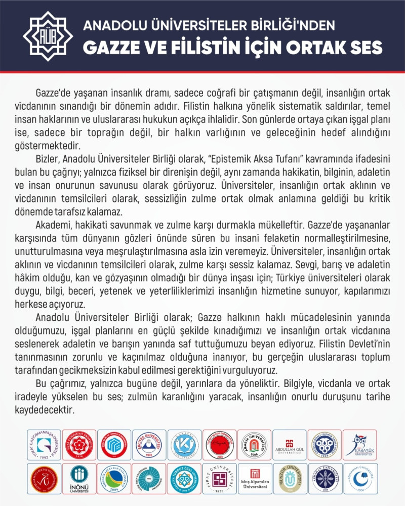 Anadolu Üniversiteler Birliği olarak; Gazze halkının haklı mücadelesinin yanında olduğumuzu, işgal planlarını en güçlü şekilde kınadığımızı ve insanlığın ortak vicdanına seslenerek adaletin ve barışın yanında saf tuttuğumuzu beyan ediyoruz. Filistin Devleti'nin tanınmasının zorunlu ve kaçınılmaz olduğuna inanıyor, bu gerçeğin uluslararası toplum tarafından gecikmeksizin kabul edilmesi gerektiğini vurguluyoruz.