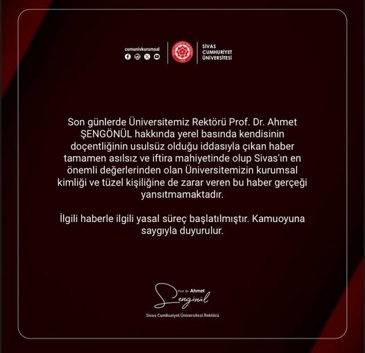 Üniversiteden yapılan yazılı açıklamada, “Son günlerde Üniversitemiz Rektörü Prof. Dr. Ahmet Şengönül hakkında yerel basında kendisinin doçentliğinin usulsüz olduğu iddiasıyla çıkan haber tamamen asılsız ve iftira mahiyetinde olup, Sivas'ın en önemli değerlerinden olan Üniversitemizin kurumsal kimliği ve tüzel kişiliğine de zarar veren bu haber gerçeği yansıtmamaktadır” denildi.