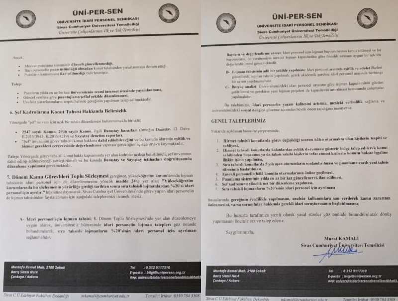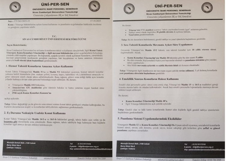 17.10.2023 tarihli ve ÜT/263/2025-53 sayılı resmi yazı ile Sivas Cumhuriyet Üniversitesi Rektörlüğü'ne başvuran ÜNİ-PER-SEN Sivas Cumhuriyet Üniversitesi Temsilciliği, lojman kullanım ve puanlama sistemindeki sorunlara dikkat çekti.