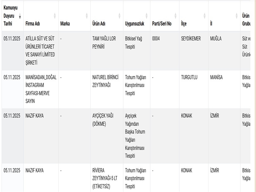 Listeye biri sağlığı tehlikeye düşürecek ürün olmak üzere toplam 18 yeni ürün daha eklendi. Listede zeytinyağı, ayçiçek yağı ve lor peyniri gibi ürünler yer aldı. Yapılan son testlerde, bazı markaların 'tam yağlı lor peyniri' ibaresiyle sattığı üründe bitkisel yağ olduğu belirlendi. Zeytinyağı ürünlerinde de taklit veya tağşiş tespiti yapıldı. Bitkisel karışım yağda ise gıdada kullanımına izin verilmeyen boya olduğu belirlendi.