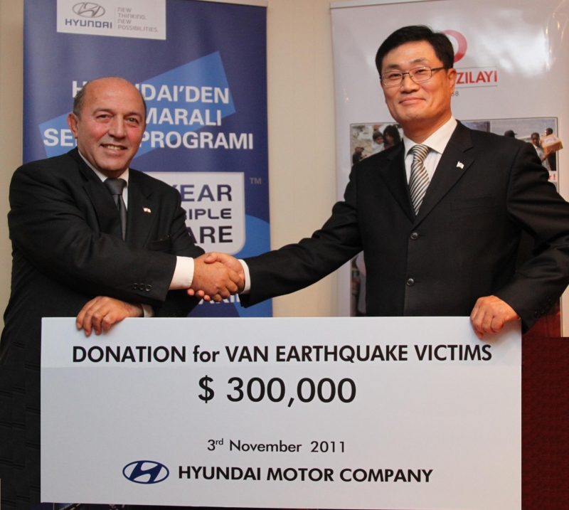 Dünyanın en hızlı büyüyen otomotiv markası olan Hyundai Motor Company, 23 Ekim’de Van’da gerçekleşen ve büyük bir hasara neden olan deprem için çok önemli ve anlamlı bir yardımda bulundu. Hyundai Motor Company, depremde oluşan yaraların sarılmasına destek olmak ve afetzedelerin barınması için yapılacak prefarik evlerin fonunda değerlendirilmek üzere Türk Kızılayı’na 300 bin Amerikan Doları (yaklaşık 540 bin TL) tutarında yardım gerçekleştirdi.