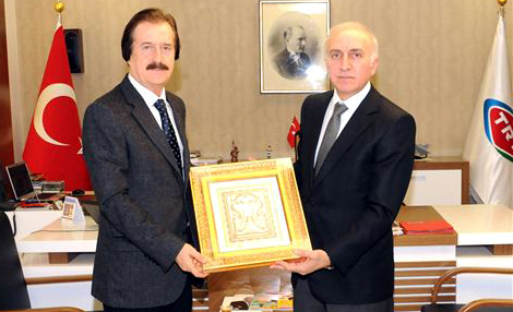 Ziyaretin ardından Rektör Prof. Dr. Kocacık, TRT Genel Müdürü Şahin'e günün anısına Çift Başlı Kartal tablosu takdim etti.